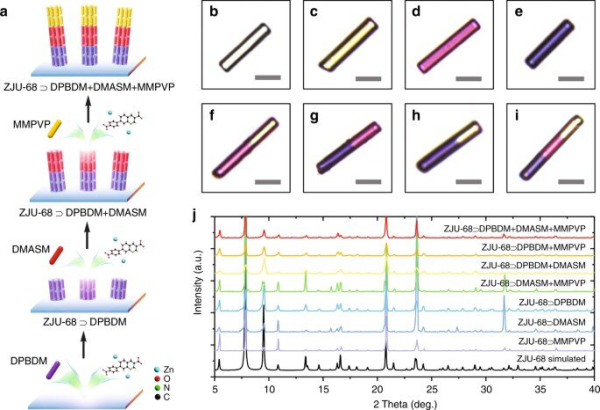 宽频、多色、偏振、单模激光可能用于多通道生化传感和成像。由染料组装的分层、同质外延混合MOF微晶产生的激光兼具宽频输出、偏振和单模激光的优点。图片来自: Science & Applications, doi: 10.1038/s46-7MOF微晶包含多种染料分子,研究人员首先借助计算机仿真揭示材料的激光模态,以探索可能的激光模式机理。他们发现了一种将多色、固态微型激光材料用于光电集成和生化传感与成像的新思路。He的团队操控MOF晶体沿单一方向生长,从而在(金属-有机)框架上组装不同的材料或染料分子,最终合成一种组装了染料的分层混合金属有机框架。合成过程中,他们第一步将锌离子(Zn2+)、一种有机偶联剂和一种染料分子自组装在一起合成染料1;接着,他们将上一步得到的微晶浸入一种由锌离子、有机偶联剂和不同的染料分子组成的新的反应溶剂中,并合成染料2;第三步,他们重复第二步并最终得到一种三色、分层、混合微晶染料。该团队将三种分别缩写为DPBDM、 DMASM 和MMPVP的染料分子组合在一起,得到不一样的混合MOF单晶。所有的混合单晶都保持和纯净的ZJU-68框架相同的六方柱结构,仅因组装了染料分子而呈现出颜色差异。组装的染料分子分别为亮黄色、品红色和紫色。该团队生成了组装在ZJU-68分层微晶上的染料的X射线粉末衍射图谱,与模拟值吻合得很好。