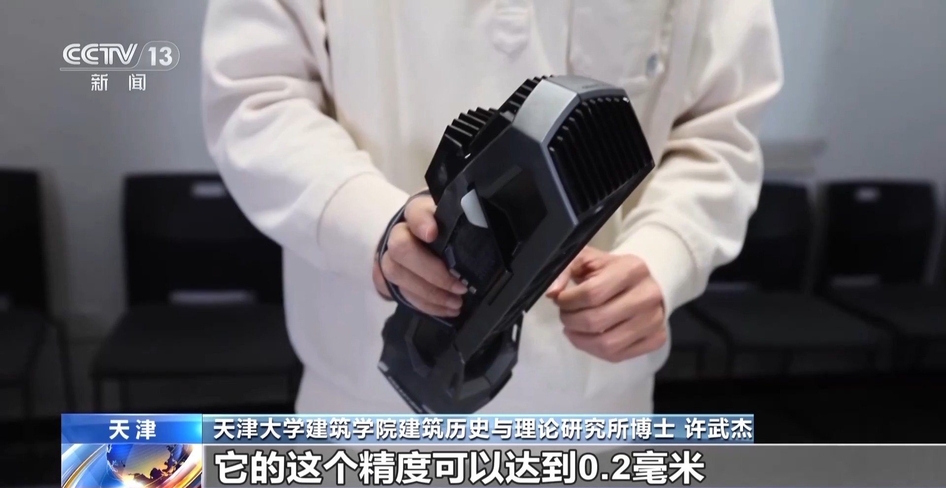 天津大学修建学院修建前史与理论研讨所博士 许武杰:这一件是咱们对最精密构件做扫描时采纳的一个设备,精度可以到达0.2毫米等级。比方晋祠有盘龙柱,柱子上龙的雕琢十分精巧,用这样的一个东西去记载能把它那些十分纤细的工匠操作和东西痕迹都留下来。